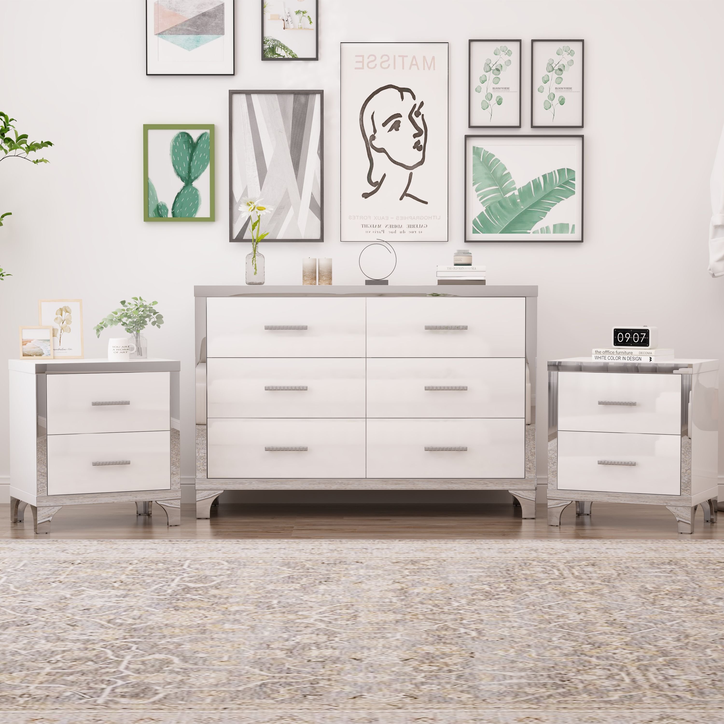 2.Framed Mirror Detailing: the front-facing edges of the dresser and nightstands are mirror-finished, creating a sleek, reflective border that adds elegance without overwhelming the design.