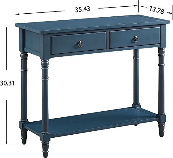 2.PORCH TABLE WITH ENOUGH STORAGE SPACE: The blue console table at the entrance has two drawers (13 '' L * 11 '' W) and a shelf at the bottom for display and storage, and a spacious rectangular table top (35.5 '' L * 13.8 '' W).