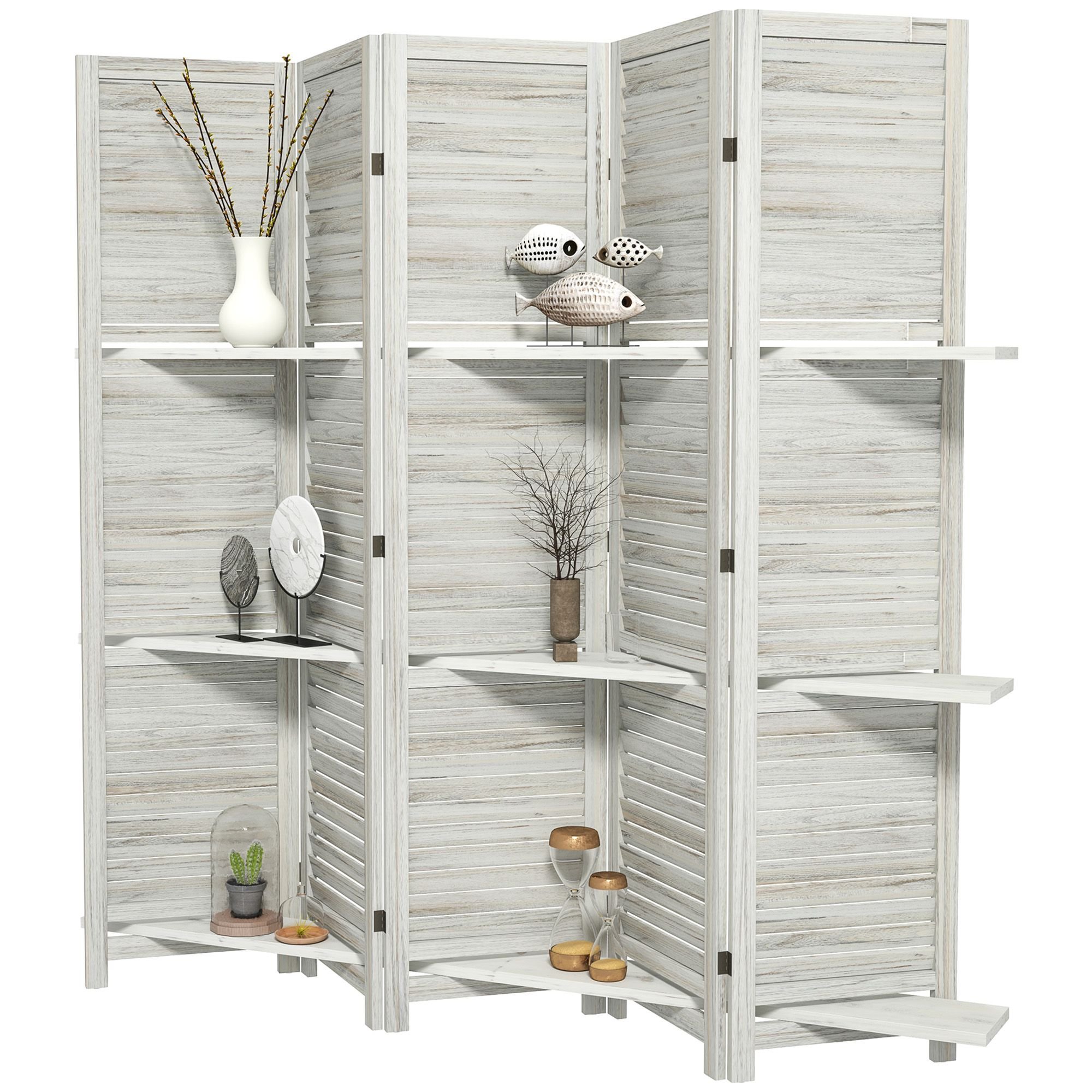 5 Panel 67" Tall Wood Privacy Screen Room Divider with 3 Shelves and Folding Storage for Bedroom, Distressed White 5 Panel 67" Tall Wood Privacy Screen Room Divider with 3 Shelves and Folding Storage for Bedroom, Distressed White 5 Panel 67" Tall Wood Privacy Screen Room Divider with 3 Shelves and Folding Storage for Bedroom, Distressed White