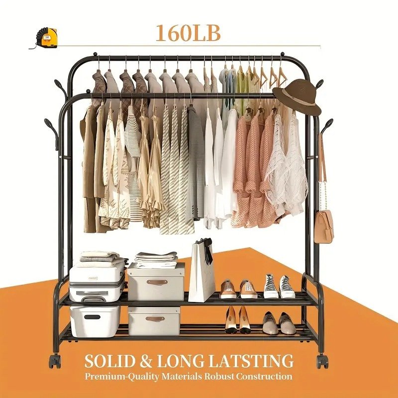 Upgrade your storage with our Heavy-Duty Double Rod Clothing Rack with Wheels, a versatile and stylish solution for your wardrobe needs. Made from robust metal, this rack provides excellent stability and durability, ensuring it can handle heavy garments without bending or wobbling.