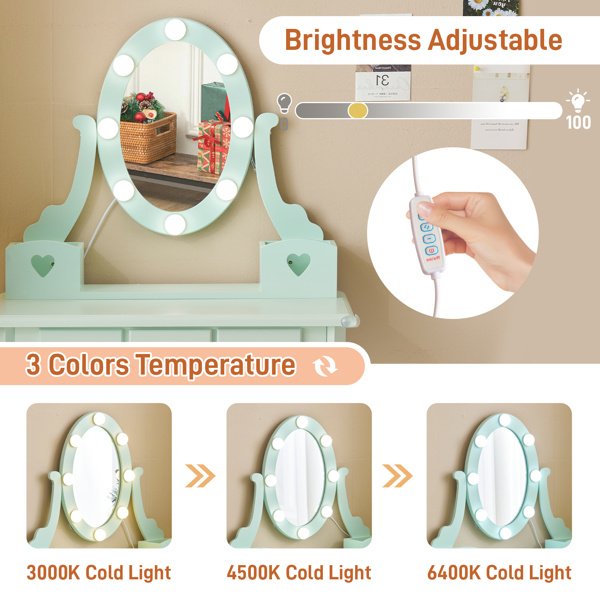 FCH Kids Vanity Set with Mirror and Lights and Stool, 5 Storage Drawers