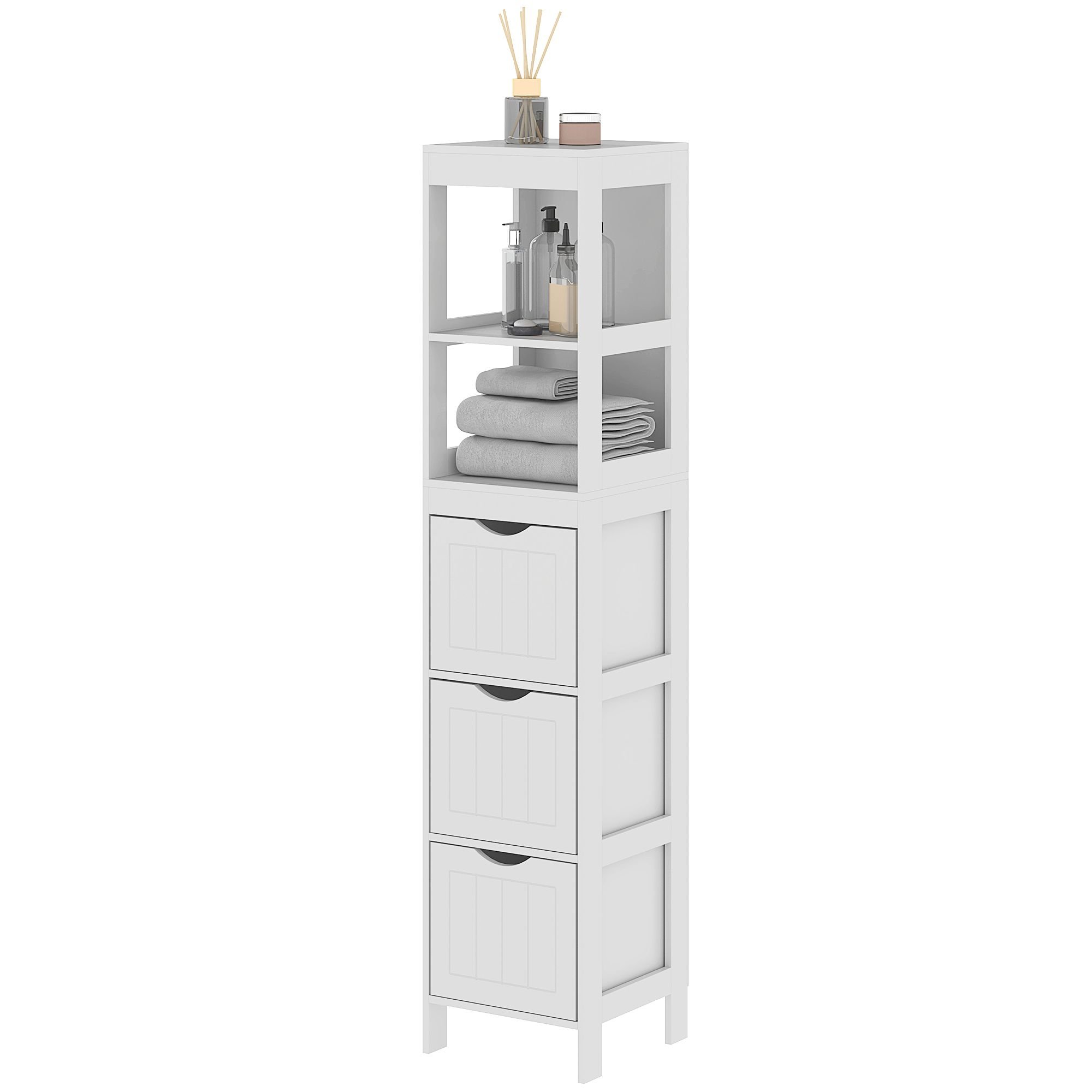 Maximize your bathroom's style and storage with the HOMCOM bathroom floor cabinet! This small cabinet features two open compartments and three drawers, making it a stellar storage unit. Its narrow design effortlessly fits into small spaces, while the chic white finish and beadboard panel add elegance. Suitable for towels, linens, and toiletries!