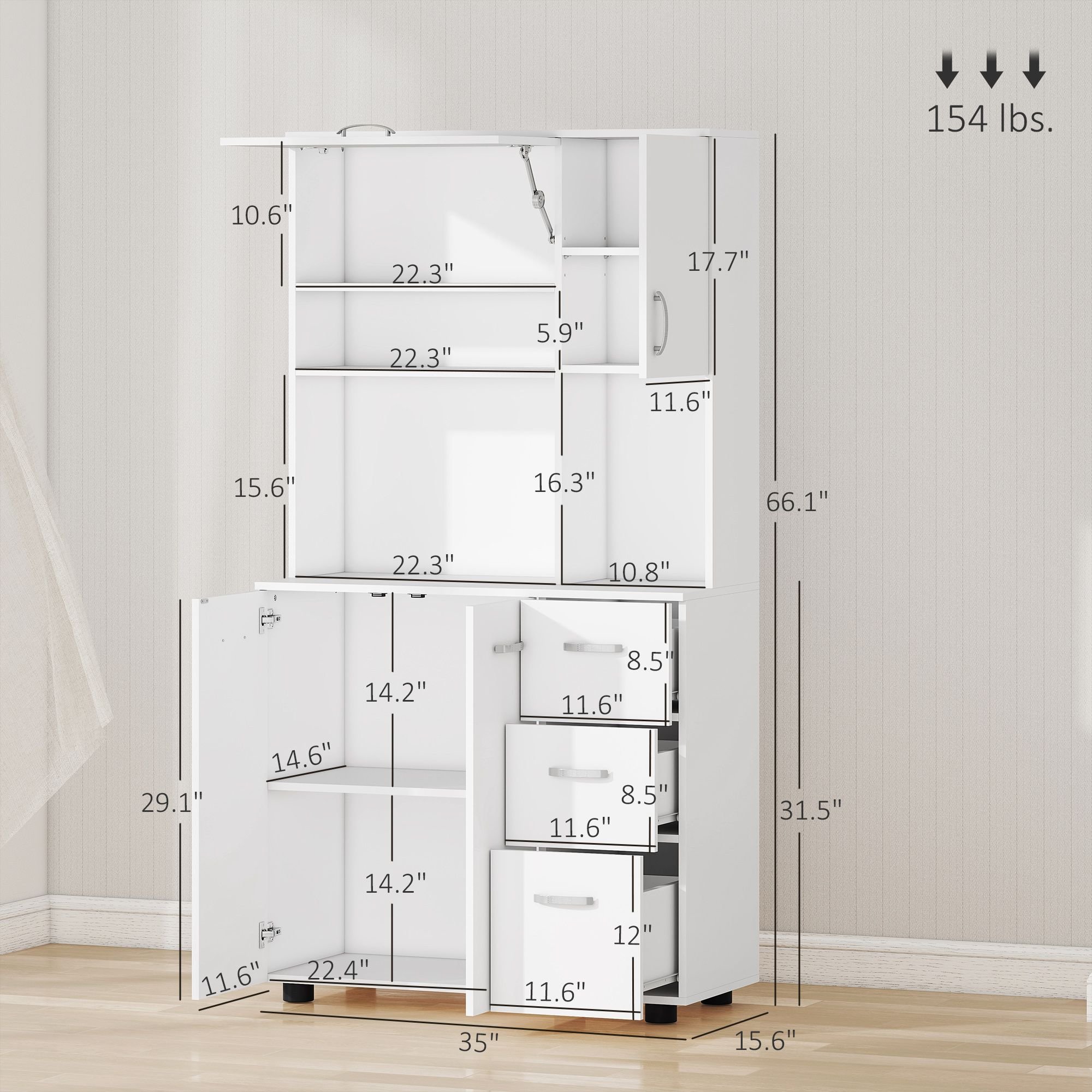 5.- Pantry Cabinets Information: 35"""" W x 15.6"""" D x 66.1"""" H, overall weight capacity: 154 lbs.