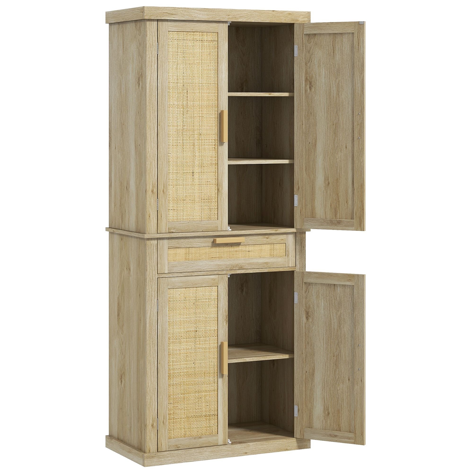 Upgrade your kitchen with the food pantry cabinet from HOMCOM. Featuring stylish rattan elemants and wood strip handles on chic oak finish body, this pantry storage cabinet adds flair to any space. With five tiers in two cabinets and a handy middle drawer, organize your kitchen essentials has never been easier. Besides, two 3-level adjustable shelves make it a versatile tall cabinet. Say hello to a clutter-free kitchen.