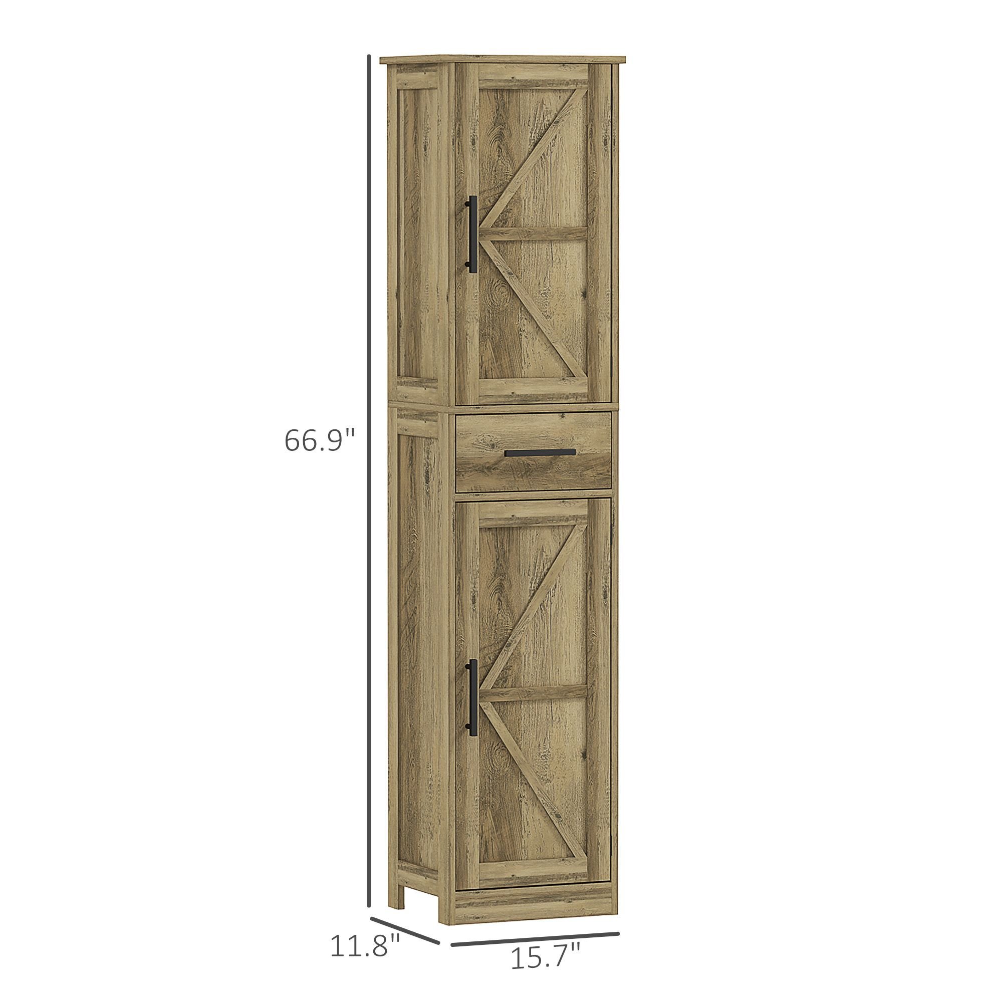 Discover the charm of farmhouse aesthetics with the tall and narrow bathroom storage cabinet from HOMCOM. This bathroom cabinet features enchanting barn doors with T-bar handles, creating a cozy and rustic vibe. Including a top two-tier cabinet, a bottom three-tier cabinet, and a middle drawer, each cabinet with a three-level adjustable shelf, our slim bathroom storage cabinet maximizes your space neatly. Suitable for those who love a tidy and stylish bathroom.